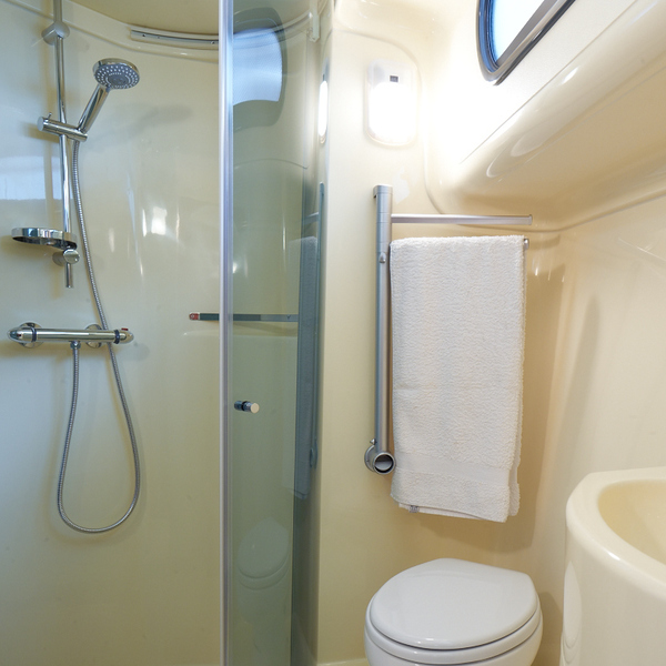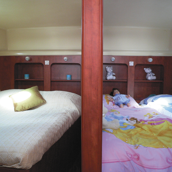 Das Boot verfügt über 2 geräumige Kabinen im Bug, eine mit Doppelbett, die andere mit zwei Einzelbetten, umbaubnar zum Doppelbett. Die Couch im Salon kann ebenfalls zu einem Doppelbett umgebaut werden.