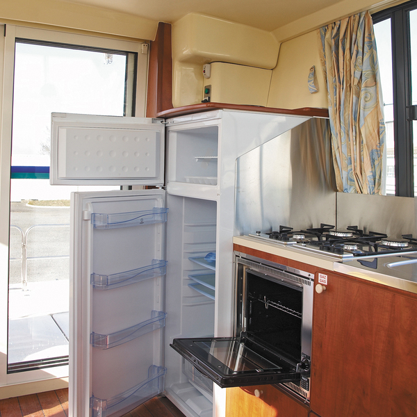 In der Küche findet sich ein großer Kühlschrank, ein 4-flammiger Gasherd mit Backofen und eine Spüle. Im Aufenthaltsbereich gibt es ein Radio mit CD/MP3-Spieler ein DVD-Gerät sowie 220-Volt Anschlüsse, wenn das Boot mit Landstrom verbunden ist. Und die Cavan verfügt auch über jede Menge Stauraum.