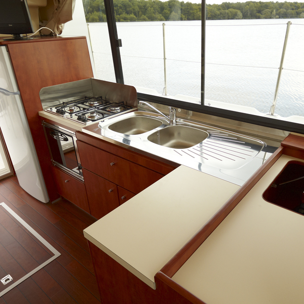 Die Bordküche ist einfach nur fabelhaft: ein großer Kühlschrank, Backofen und Herd. Und es gibt ebenso ein Radio/CD/DVD-Gerät und einen Landstromanschluß. Und es gibt unendlich viel Stauraum an Bord.