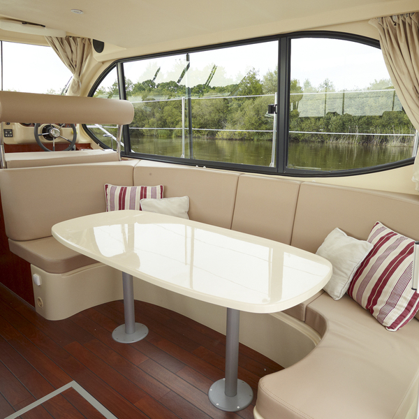 Eine neue Ergänzung unserer Flotte für die Saison 2025: die Galway Octo hat einen herrlichen, hellen Wohnbereich. Die großen Fensterflächen rundherum bieten einen tollen Ausblick auf die Gegend und am Heck befindet sich ein großzügiger Aussenbereich, gut geeignet auch für ein Essen im Freien.